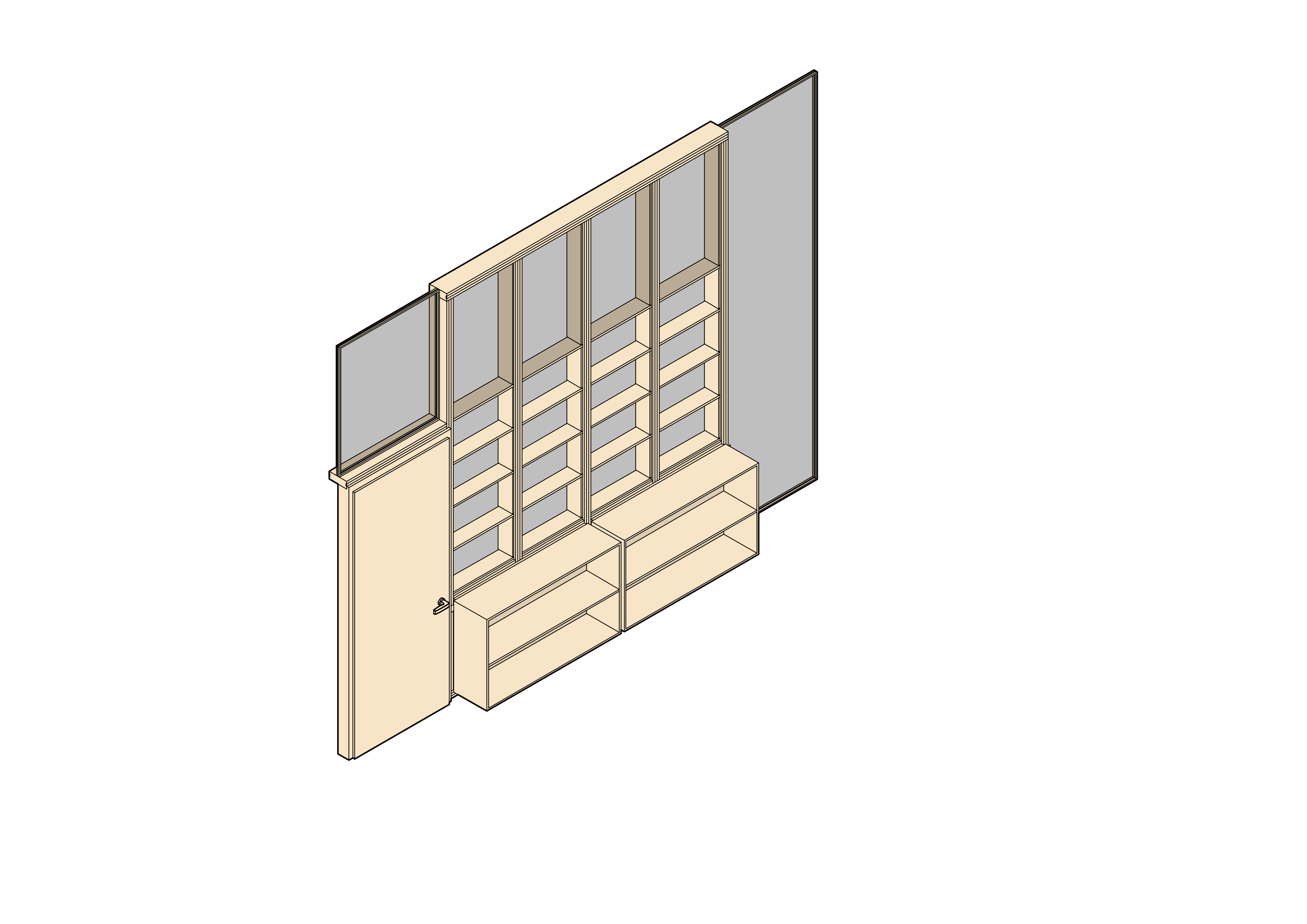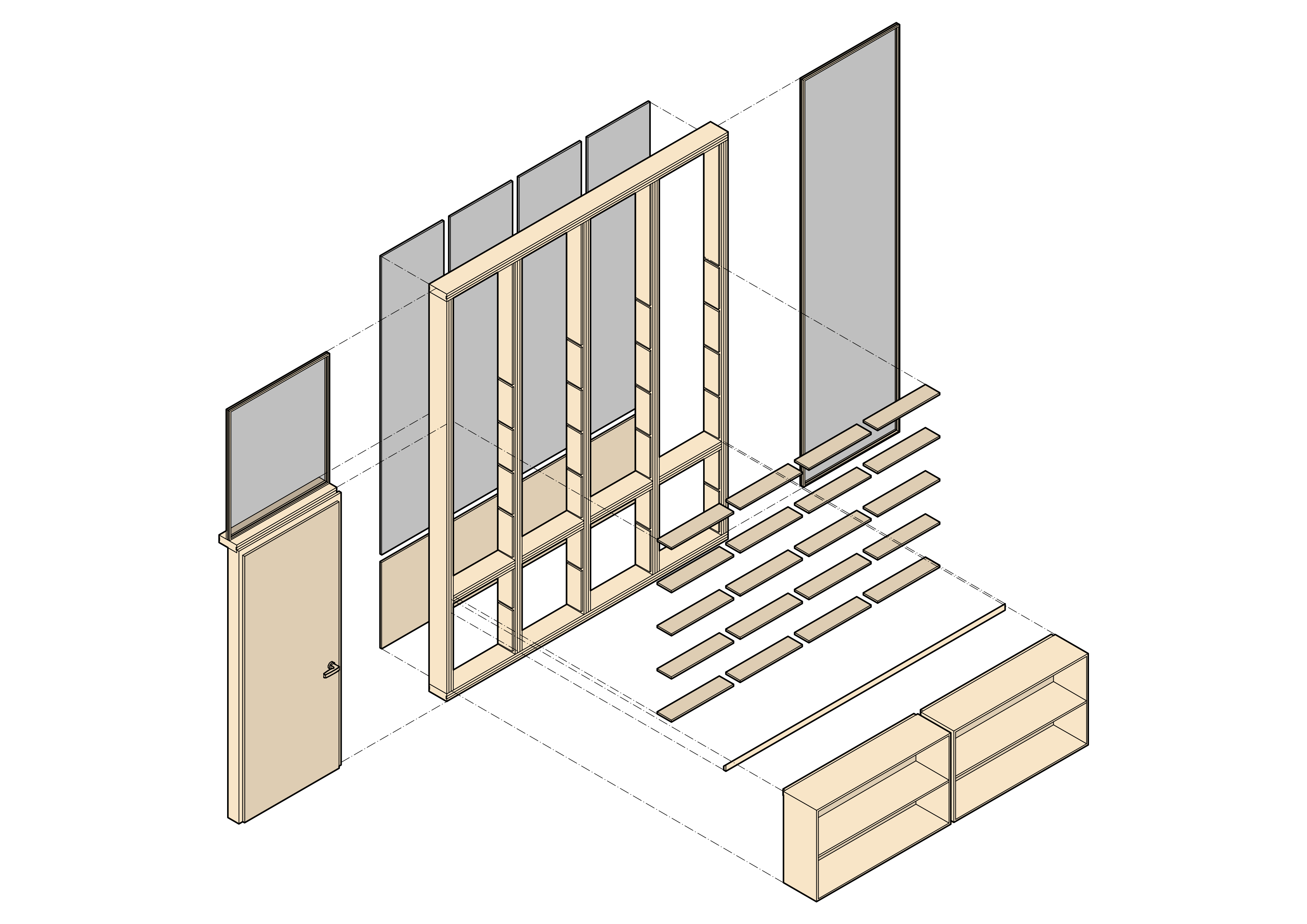 Auf die Oberflächenbehandlung der Hölzer wurde weitestgehend verzichtet. Nur die Oberflächen der Regale, Fußböden und Türrahmen wurden mit Öl eingelassen, um der Fleckenbildung vorzubeugen. Alle sonstigen Hölzer sind unbehandelt und können anschließend recycelt werden.