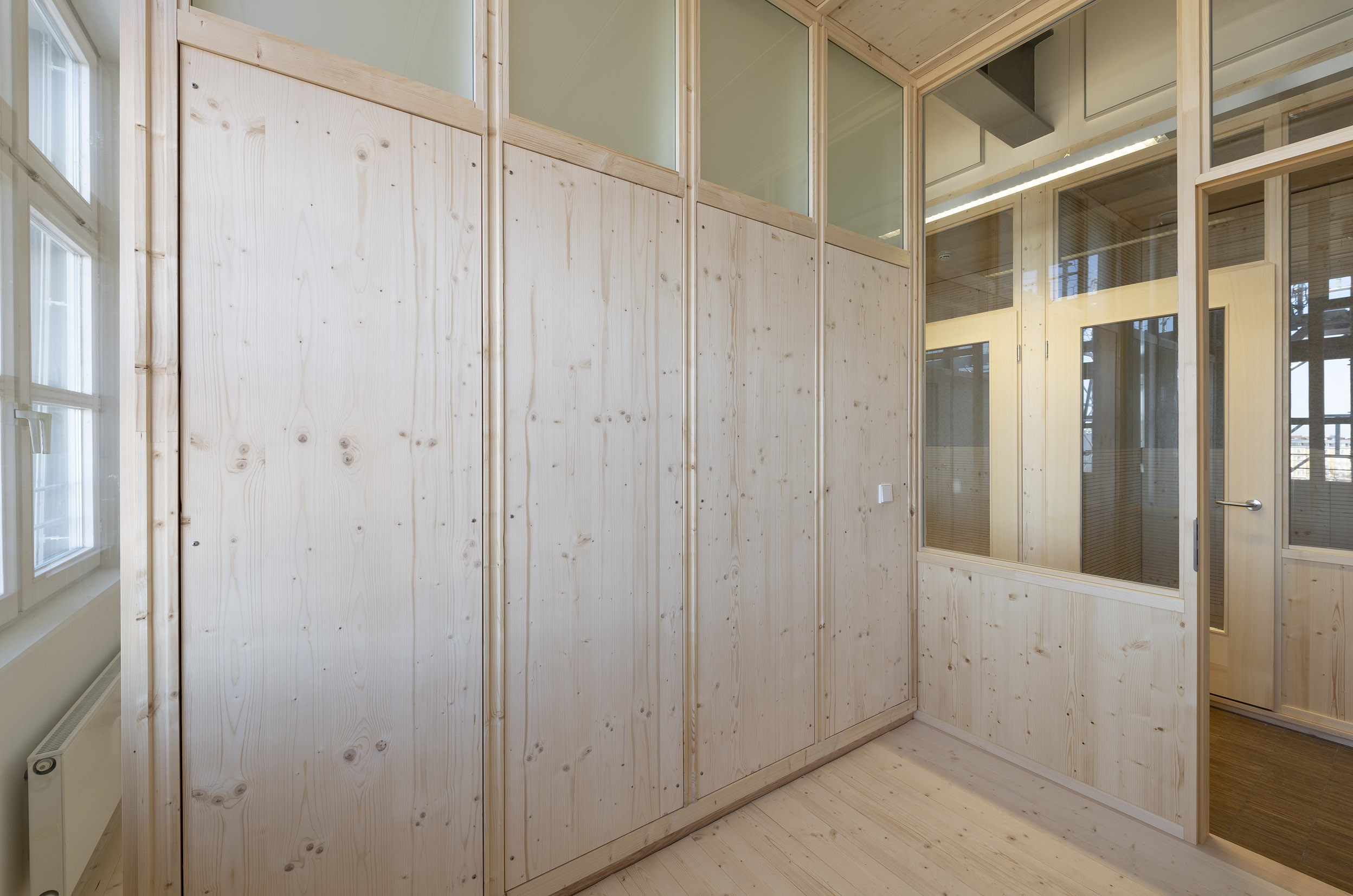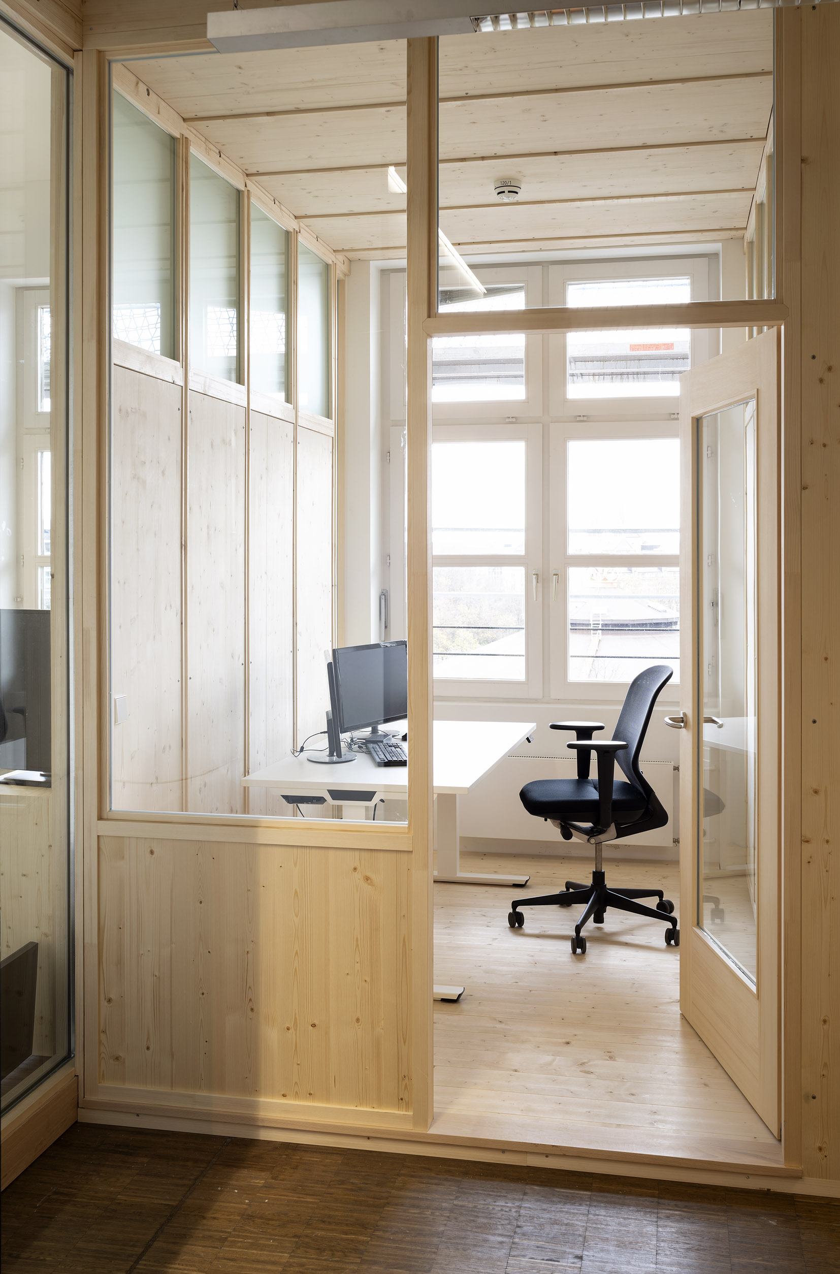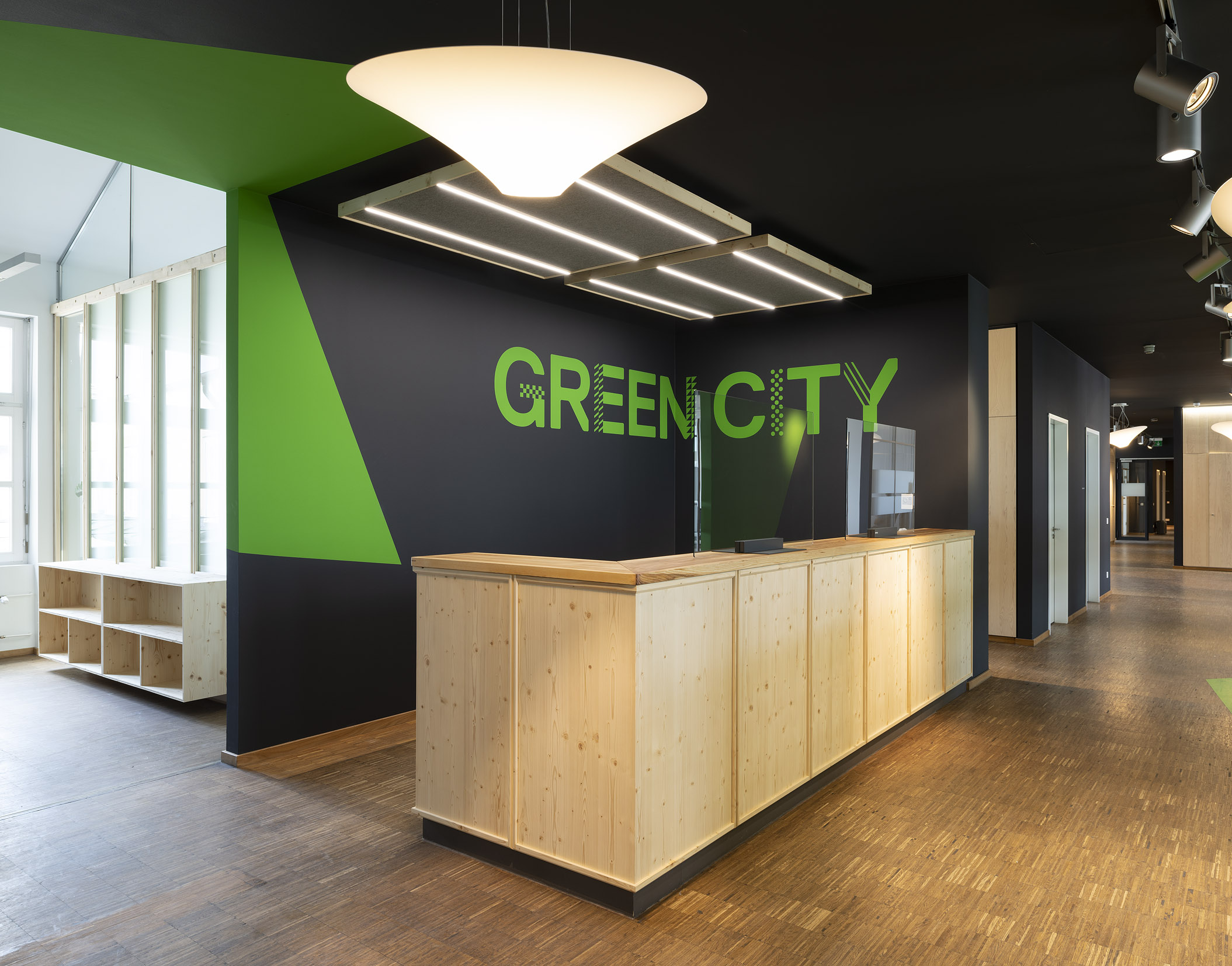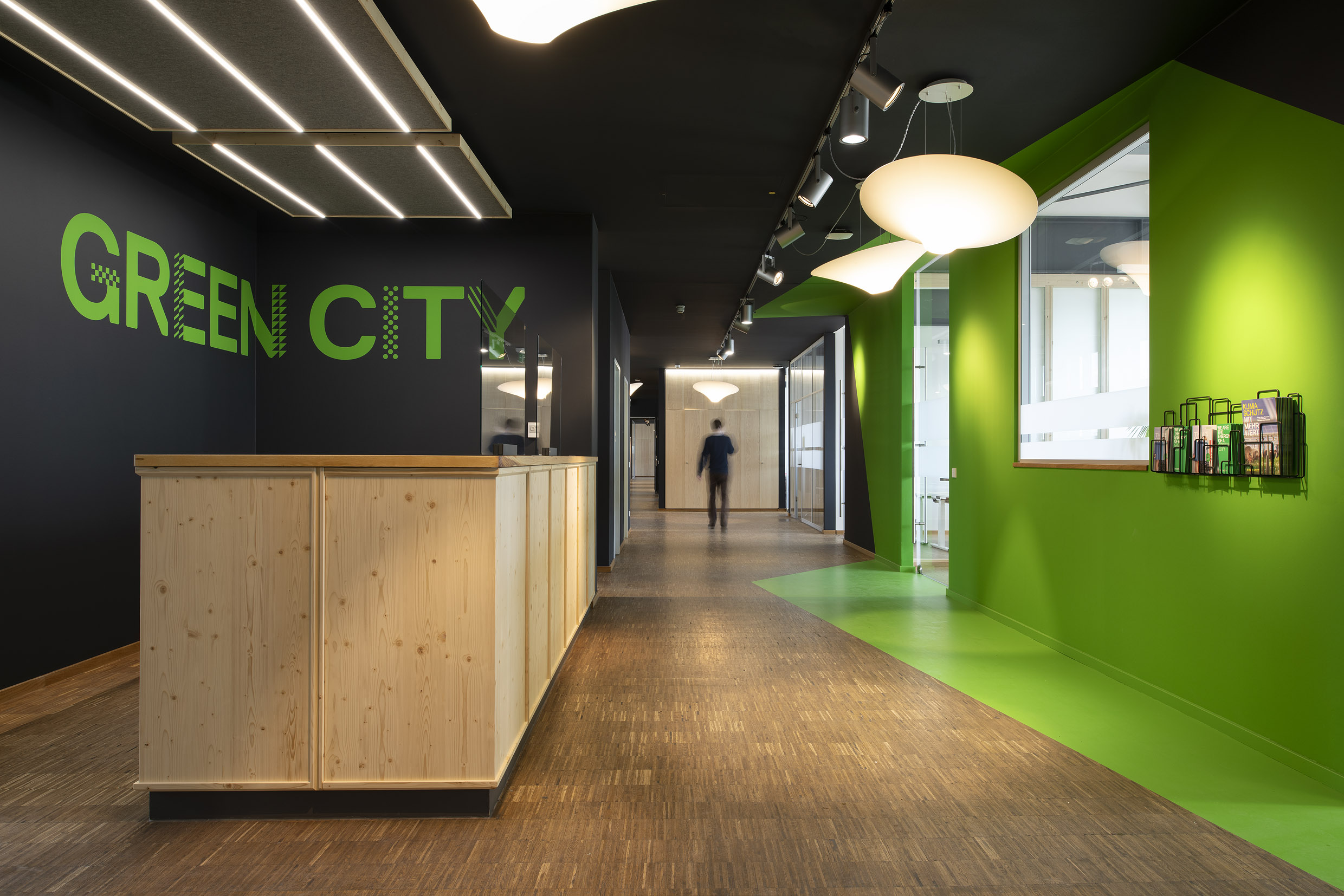 Die Büroräume von Green City im Art Deco Palais sollten neu und kleinteiliger organisiert werden – und dies im Eiltempo. Unser Vorschlag sieht deshalb verglaste Trennwände aus Holz vor. Der nachwachsende Baustoff scheint aufgrund der hohen Nachhaltigkeit für die Green City AG und dem damit verbundenen Anspruch ein idealer Baustoff. Die Herausforderung lag vor allem darin, die Konstruktion flexibel zu gestalten und gleichzeitig die Anforderungen wie Schallschutz an ein modernes Büroumfeld zu erfüllen.