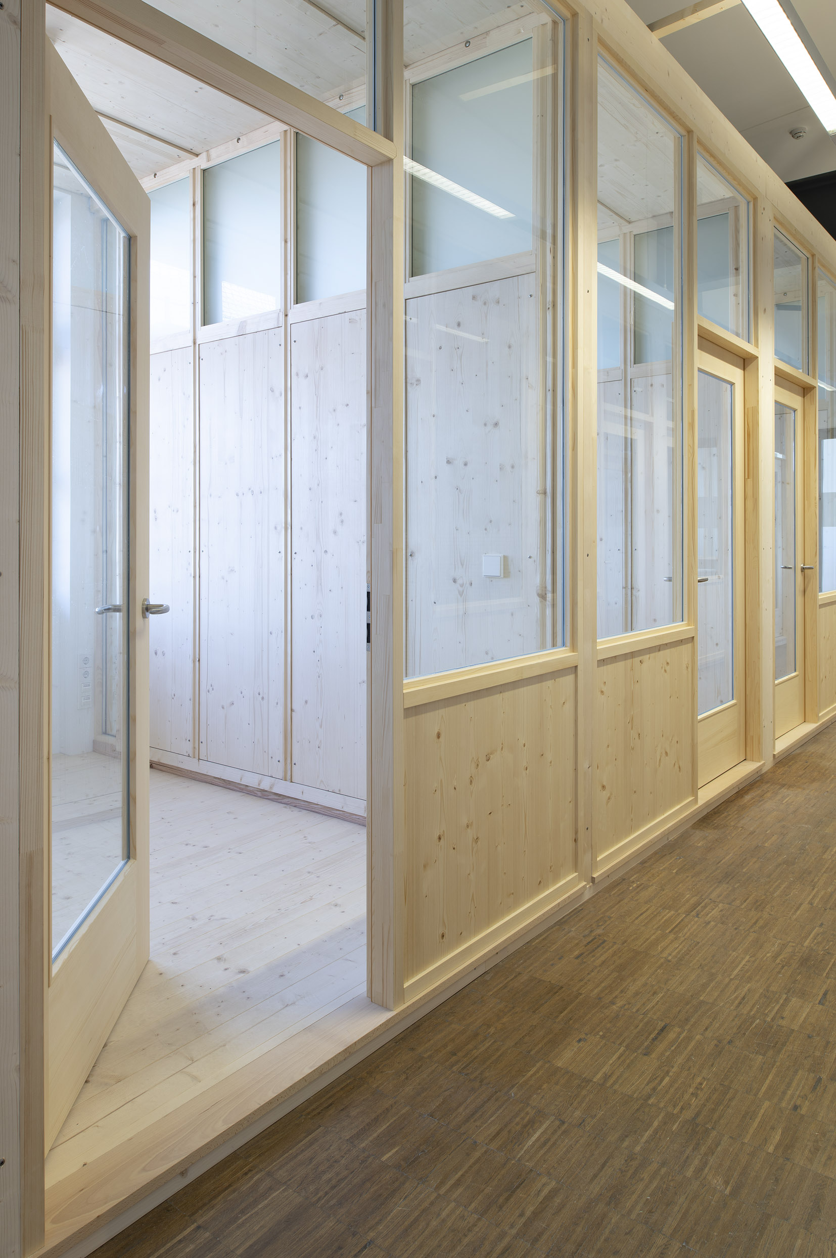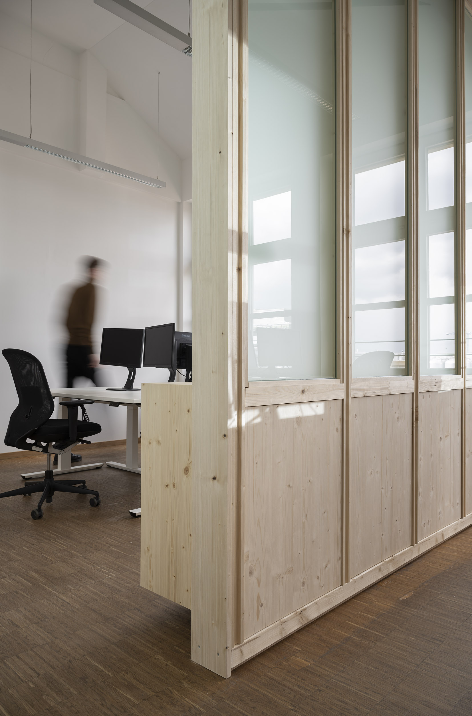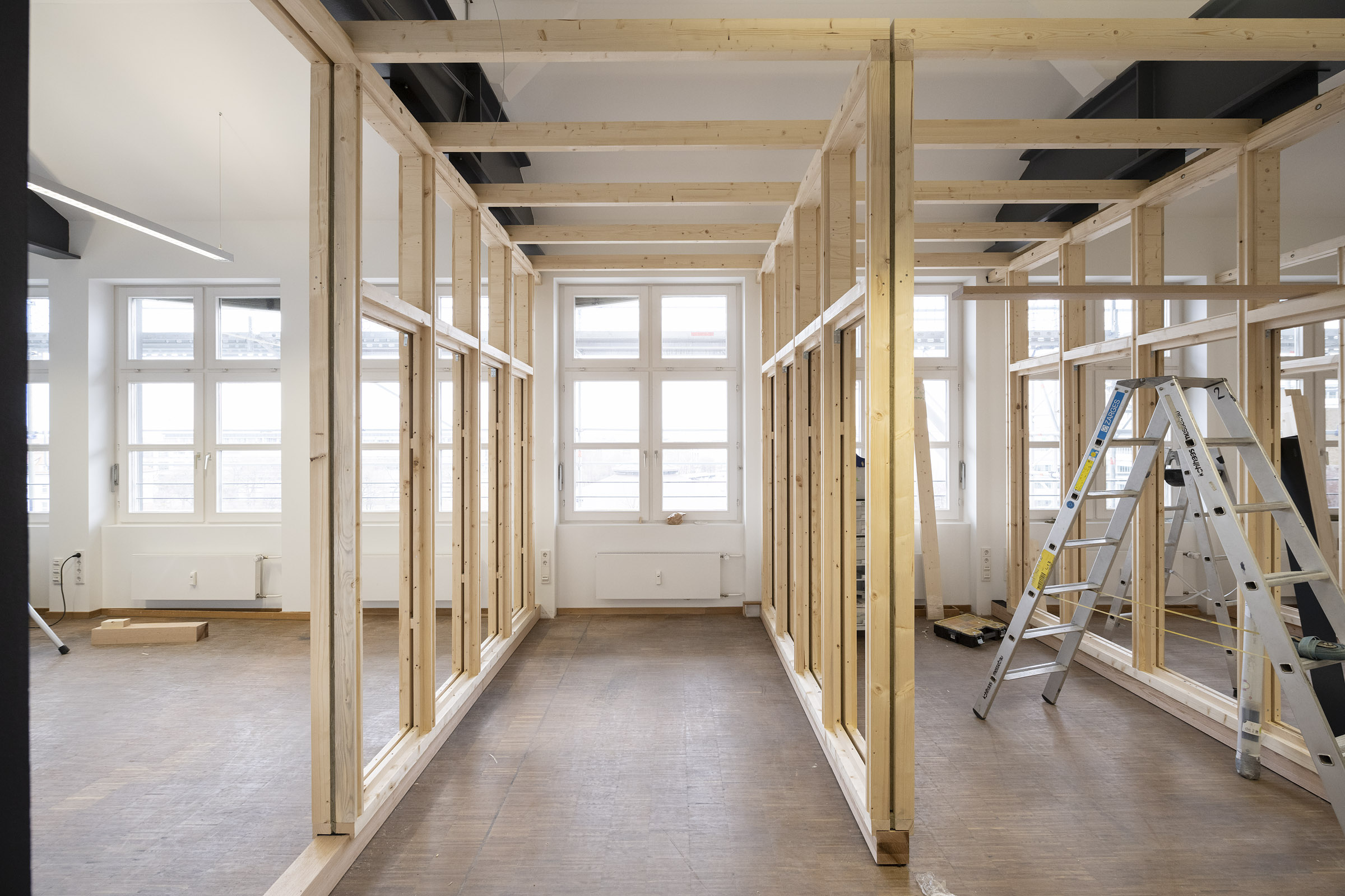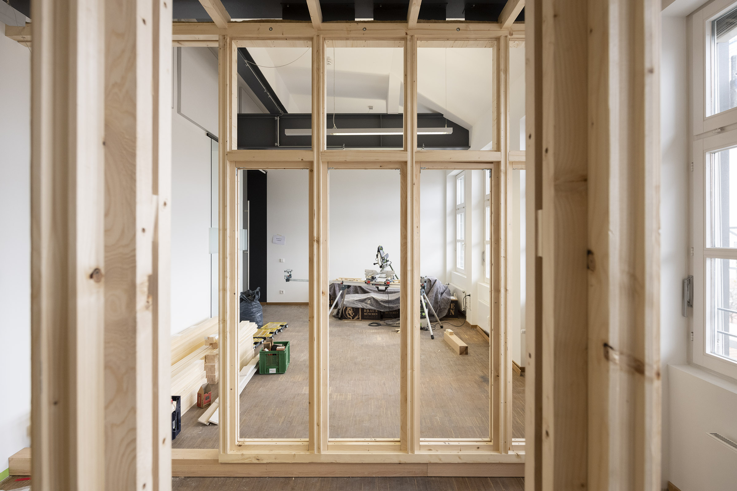 Die Büroräume von Green City im Art Deco Palais sollten neu und kleinteiliger organisiert werden – und dies im Eiltempo. Unser Vorschlag sieht deshalb verglaste Trennwände aus Holz vor. Der nachwachsende Baustoff scheint aufgrund der hohen Nachhaltigkeit für die Green City AG und dem damit verbundenen Anspruch ein idealer Baustoff. Die Herausforderung lag vor allem darin, die Konstruktion flexibel zu gestalten und gleichzeitig die Anforderungen wie Schallschutz an ein modernes Büroumfeld zu erfüllen.
