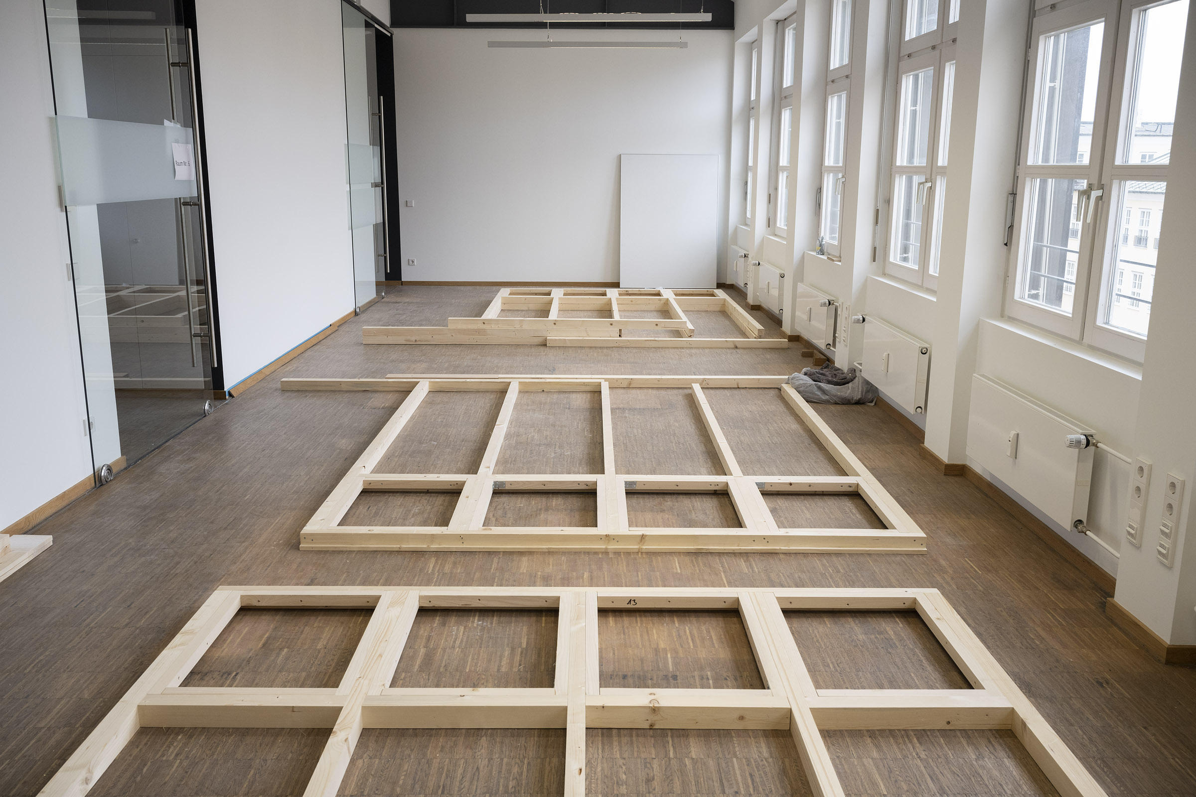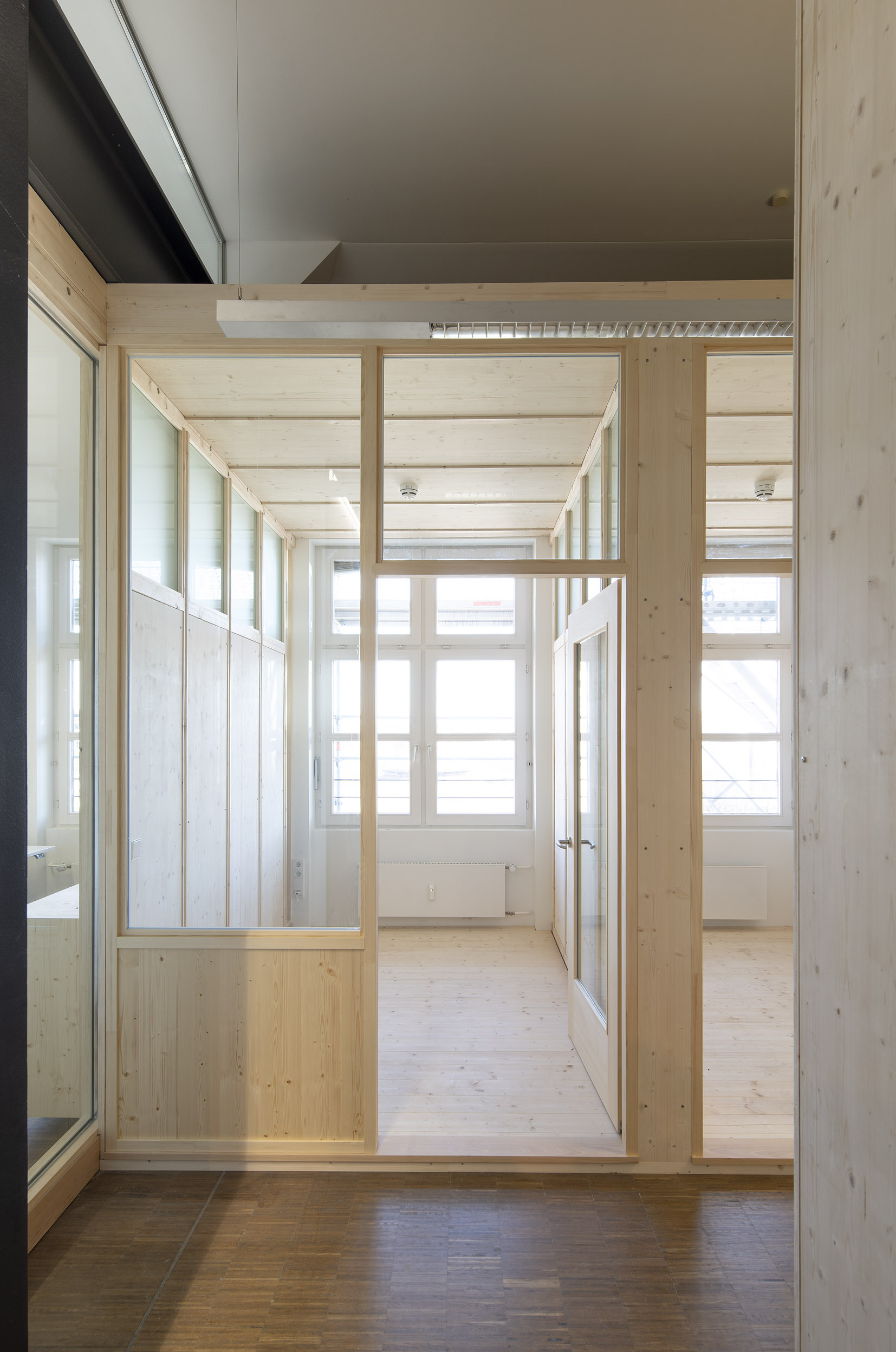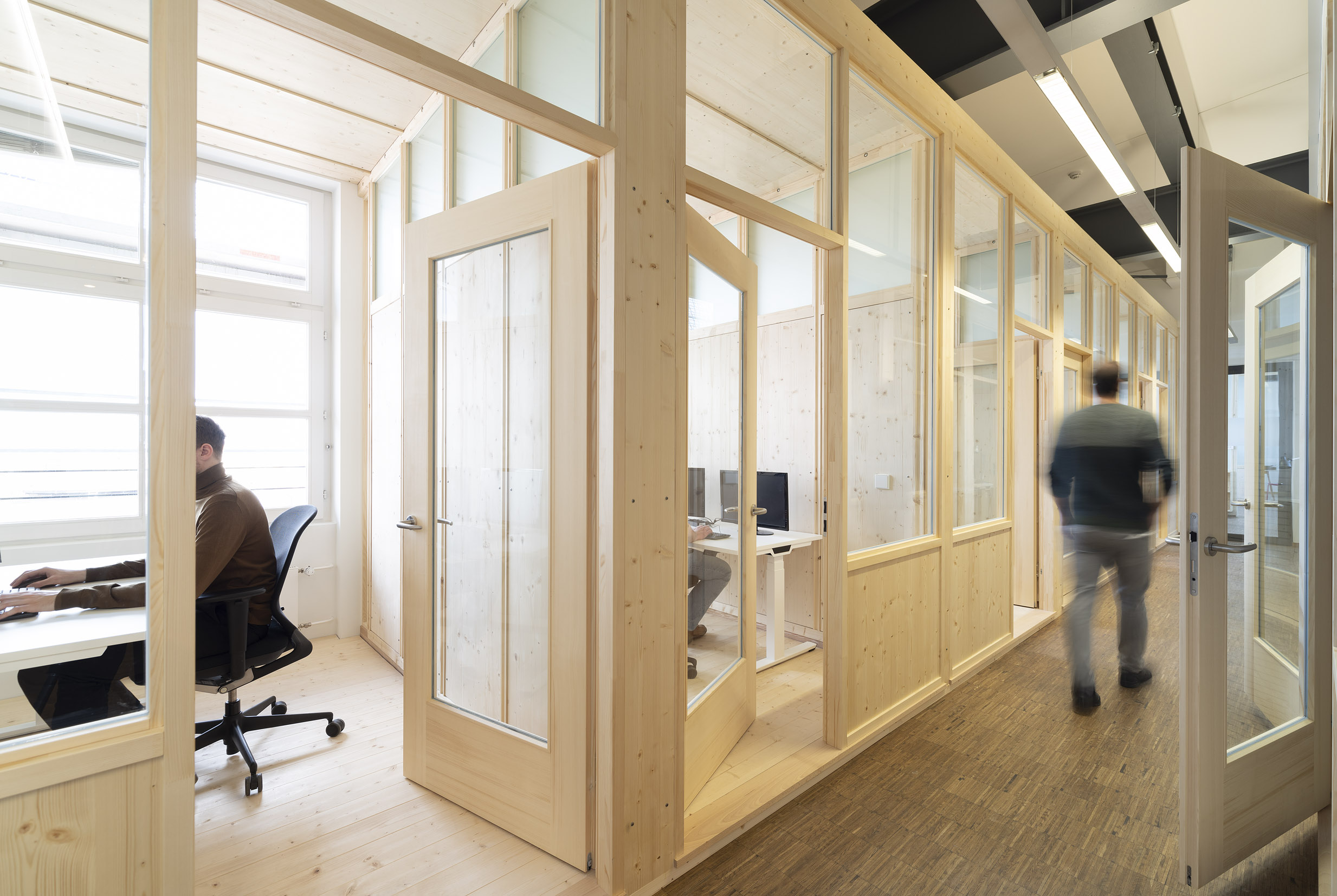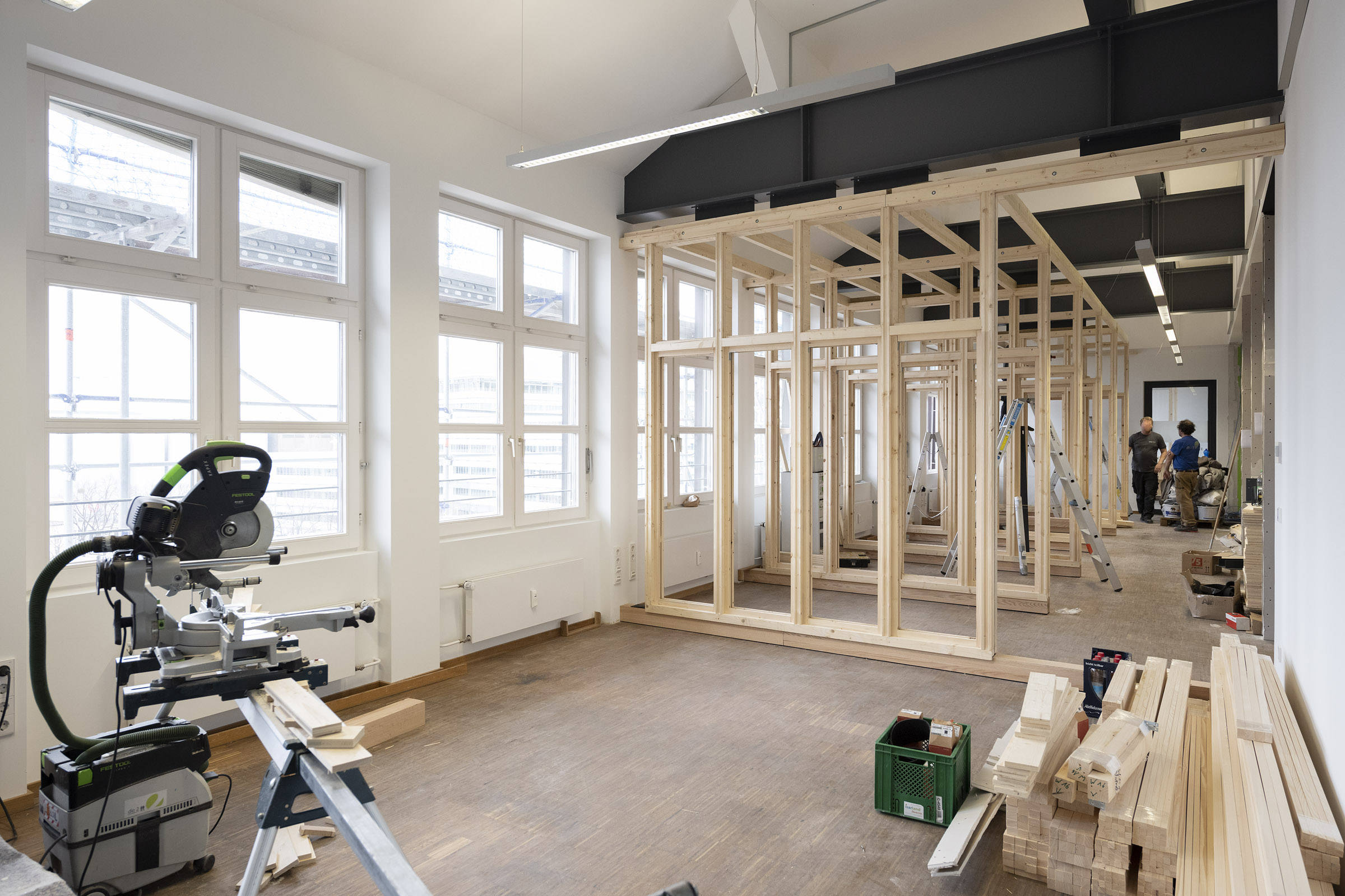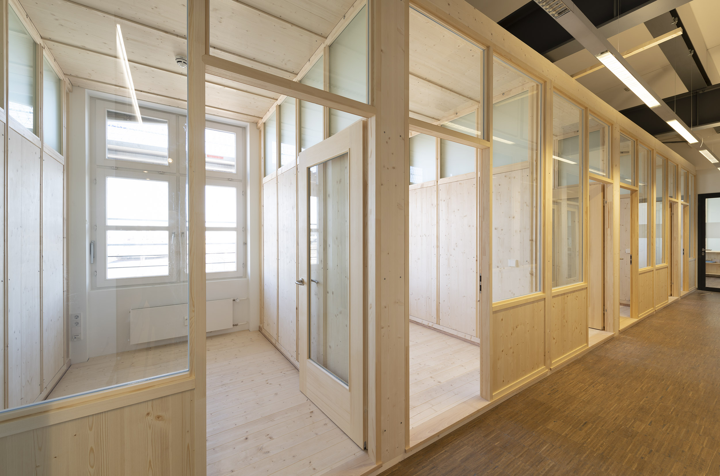 Die Büroräume von Green City im Art Deco Palais sollten neu und kleinteiliger organisiert werden – und dies im Eiltempo. Unser Vorschlag sieht deshalb verglaste Trennwände aus Holz vor. Der nachwachsende Baustoff scheint aufgrund der hohen Nachhaltigkeit für die Green City AG und dem damit verbundenen Anspruch ein idealer Baustoff. Die Herausforderung lag vor allem darin, die Konstruktion flexibel zu gestalten und gleichzeitig die Anforderungen wie Schallschutz an ein modernes Büroumfeld zu erfüllen.